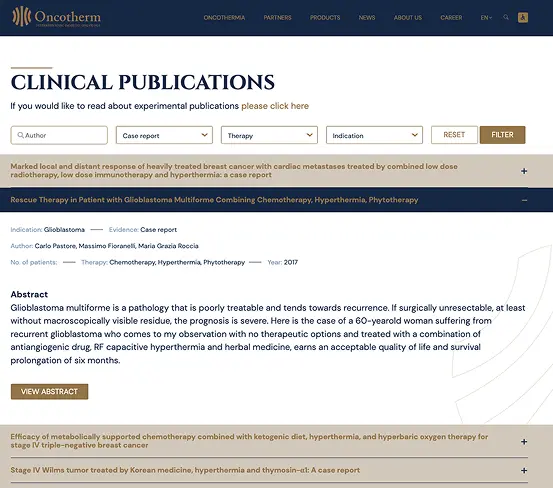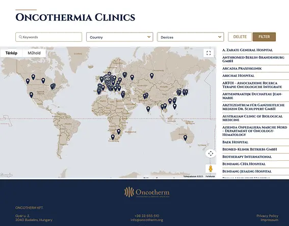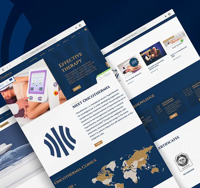 The Oncotherm site comprises approximately 20 cleanly structured subpages—each tier translated into Hungarian, German, and English versions.